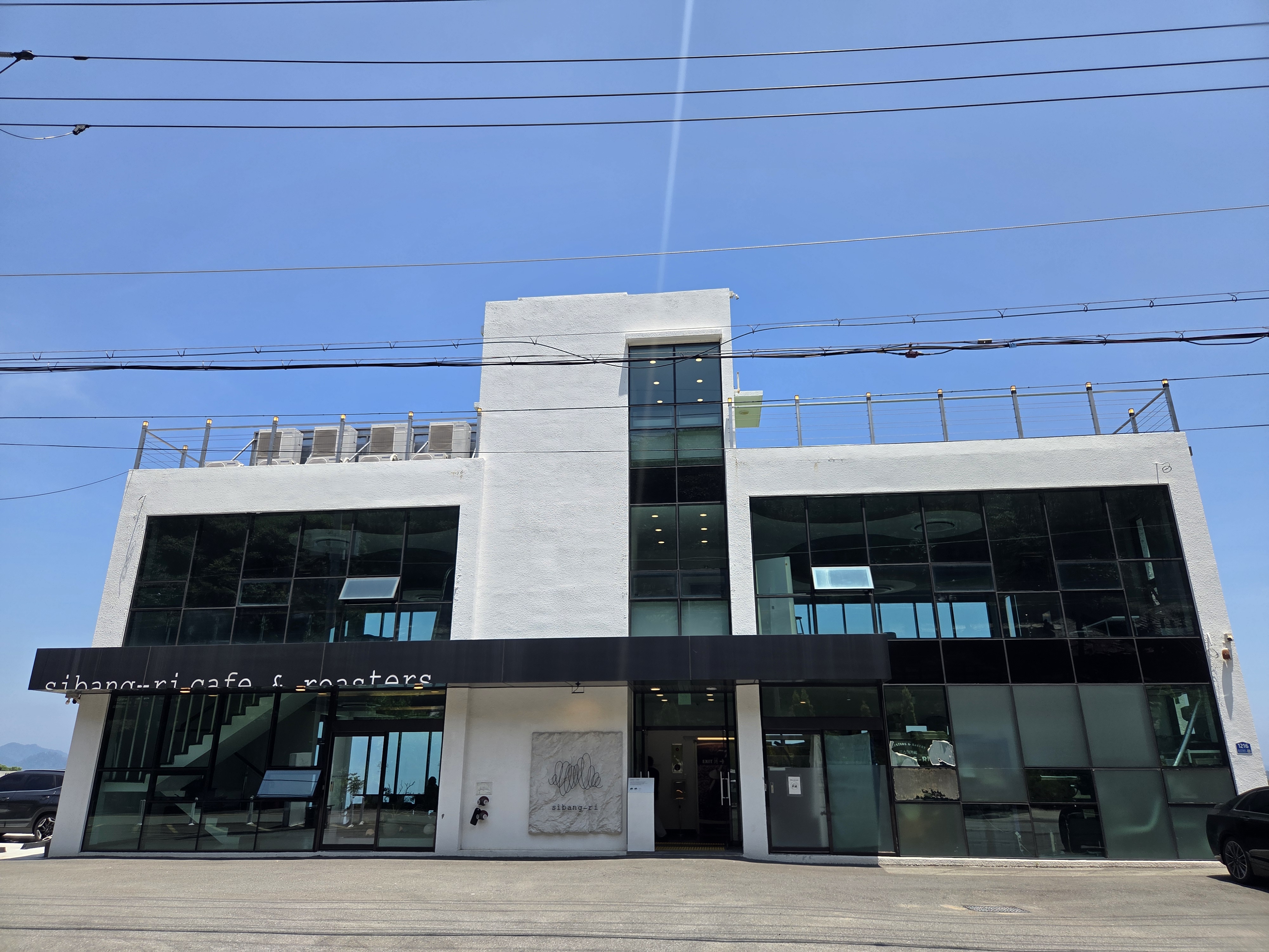 모던하고 깔끔한 디자인의 건물은 하얀 외관과 큰 유리창이 인상적이었고, 입구에 걸린 검은색 차양 아래에는 ‘sibang-ri cafe & roasters’라는 이름이 세련되게 보였어요.