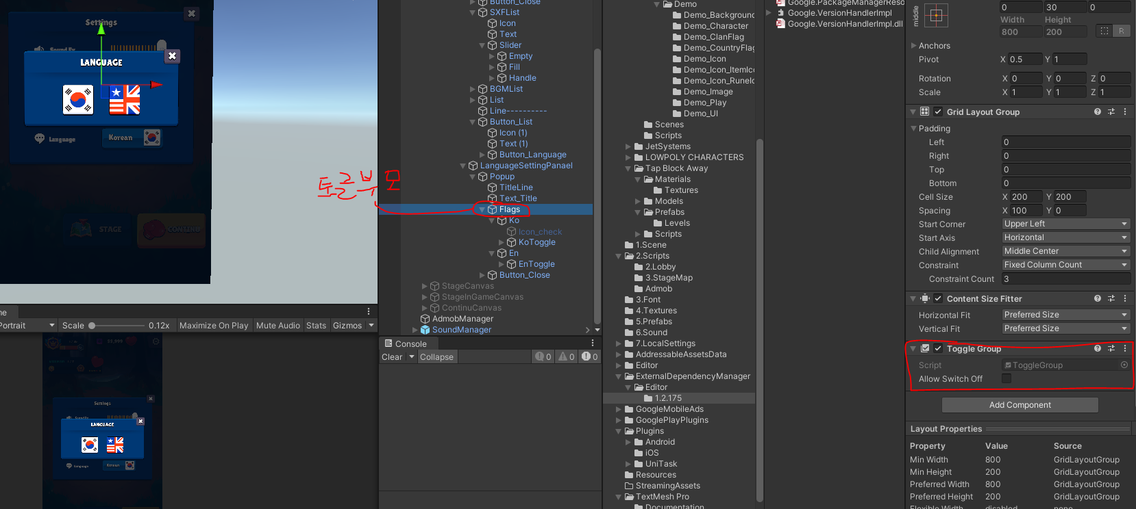 "KoToggle", "EnToggle"은 자식 토글들 이름이다.