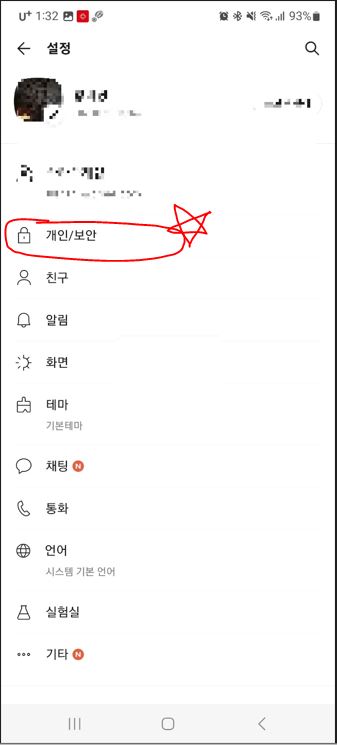 카카오톡 - 하단 오른쪽 아래[...] - 상단 오른쪽 톱니바퀴 - 개인/보안 -