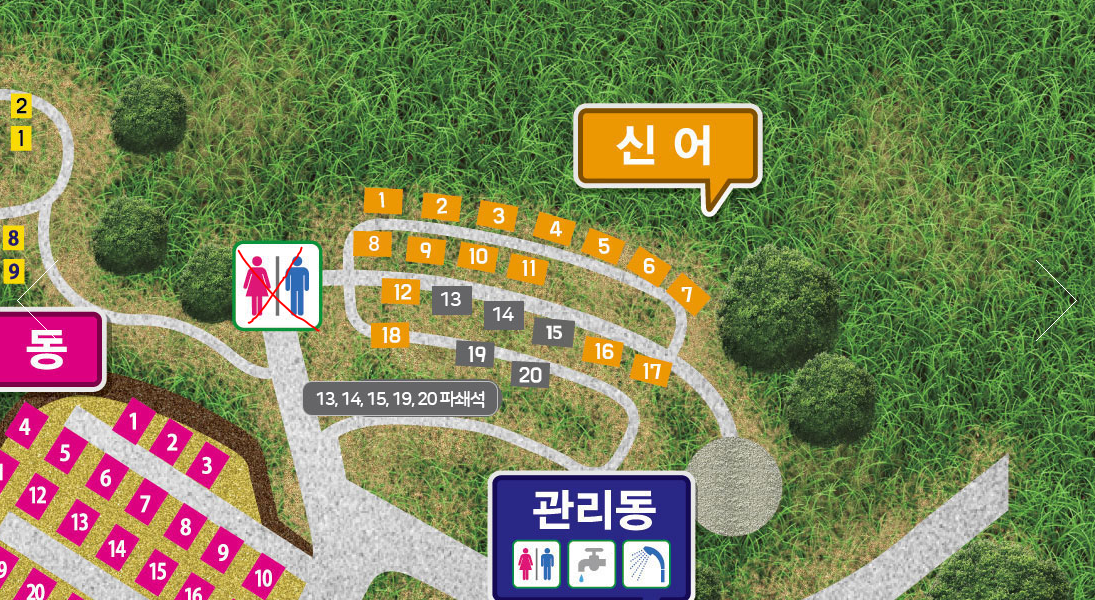 왼쪽이 수로(카라반) 존이고, 오른쪽이 김해(미니 글램핑) 존이다.